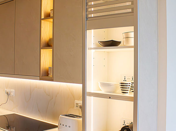 Modern Kitchen with Curved Peninsula and Integrated Living Room Bar
